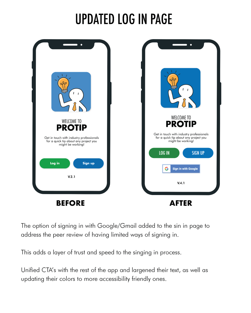 Reaching version 4.1 of my app, I had finalized my designs and function. I at this stage I put together finishing touches such as creating consistency through the app and creating an accessibility friendly color scheme. I developed ProTips brand identity, voice, and guidelines. This is the final results of all my research and development coming together.