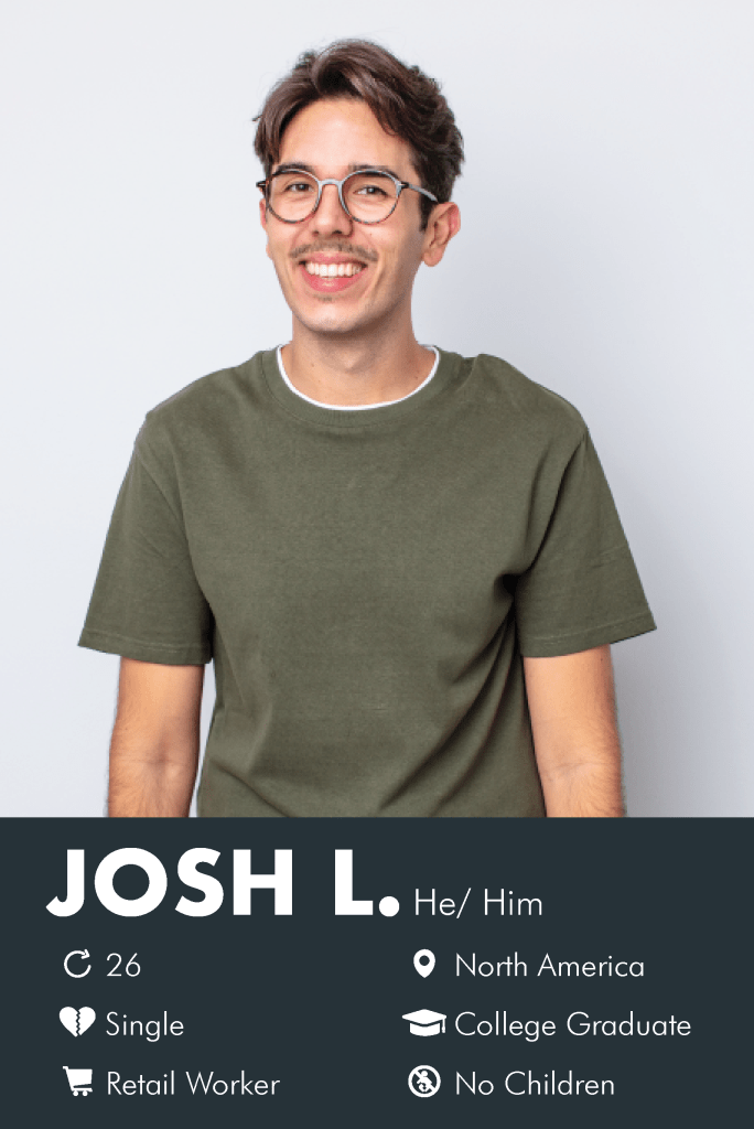 Josh is a 26-year-old single retail worker who lives in north America. He spends a lot of time on his phone on his downtime at work or while on public transportation. Due to being out of the environment and never visiting his country of origin, he only has a basic understanding of his native tongue (Spanish). he is losing touch with his extended family because of it.